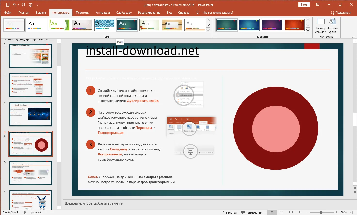 В Microsoft PowerPoint 2020 появилась новая функция трансформации, она позволяет создавать анимированный переход из одного слайда в другой. Анимироваться могут различные объекты — рисунки, текст, графические элементы. Для использования функции трансформации понадобится подключение к интернету.